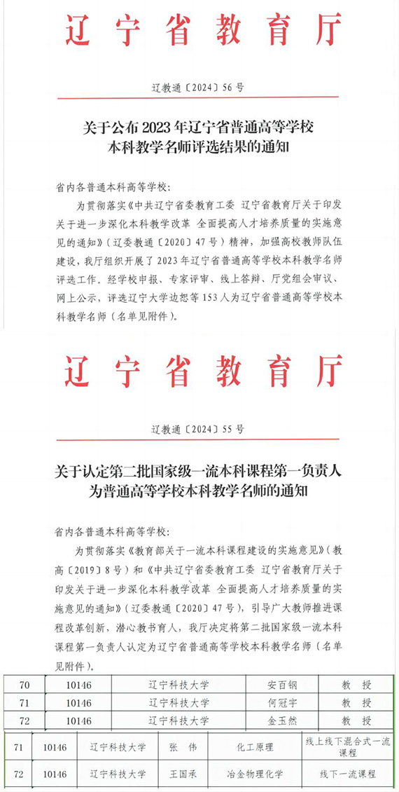 近日,根据辽宁省教育厅《关于公布2023年辽宁省普通高等学校本科教学名师评选结果的通知》(辽教通〔2024〕56号),米兰电竞(中国)官方网站化学工程学院安百钢教授、工商管理学院金玉然教授、艺术学院何冠宇教授获评2023年辽宁省普通高等学校本科教学名师。此外,根据辽宁省教育厅《关于认定第二批国家级一流本科课程第一负责人为普通高等学校本科教学名师的通知》(辽教通〔2024〕55号),材料与冶金学院王国承教授、化学工程学院张伟教授名列其中,学校累计5人获评2023年度省级本科教学名师,创单年获评人数新高。