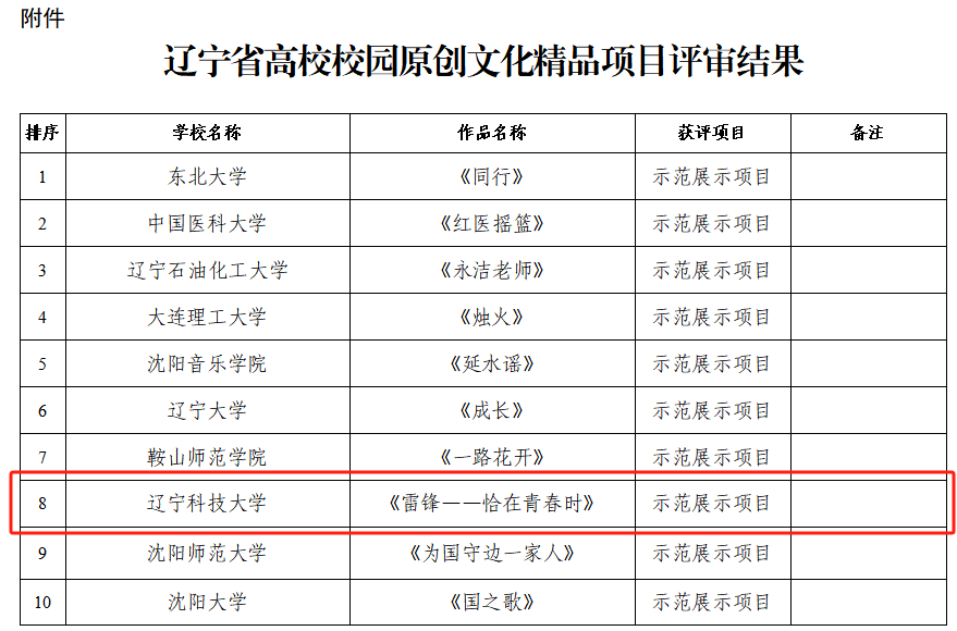 4月16日,辽宁省教育厅公布了《关于辽宁省高校校园原创文化精品项目评审结果的公示》。米兰电竞(中国)官方网站申报的原创舞台剧《雷锋——恰在青春时》成功入选,并获评“十个示范展示项目”,一同获评的还有东北大学、大连理工大学、沈阳音乐学院等高校。