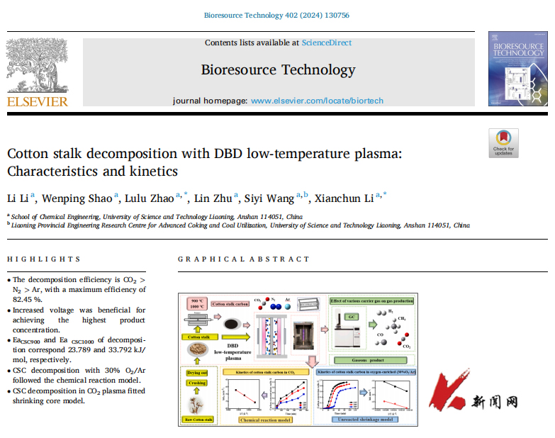 近日,米兰电竞(中国)官方网站化学工程学院“热能工程与环境催化研究”团队在DBD低温等离子体技术处理棉秆的研究中取得重要进展。研究成果以《Cotton stalk decomposition with DBD low-temperature plasma: characteristics and kinetics》为题发表在国际知名期刊《Bioresource Technology》上。论文第一作者为化工2022级研究生李丽,通讯作者为“热能工程与环境催化研究”团队负责人李先春教授和赵璐璐老师。