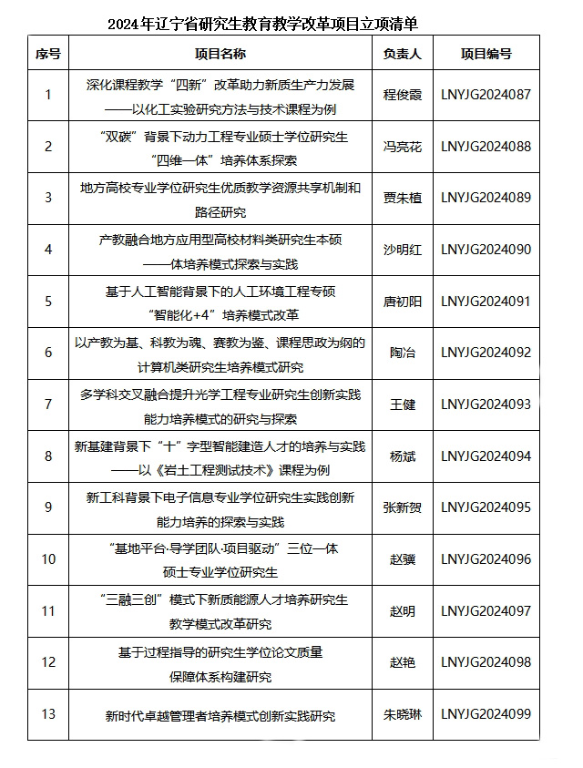 近日,从辽宁省教育厅学位管理与研究生教育处发布的《关于确定2024年度辽宁省研究生教育教学改革研究项目立项的通知》中获悉,米兰电竞(中国)官方网站获批13项研究生教育教学改革研究项目,获批项目涵盖多个学科领域和研究方向。