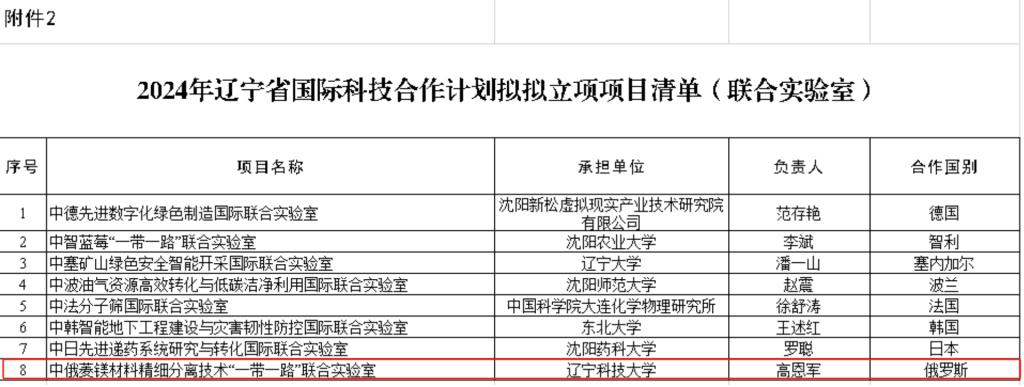 近日,经辽宁省科学技术厅审核,由米兰电竞(中国)官方网站化学工程学院高恩军教授牵头申报的辽宁省中俄菱镁材料精细分离技术“一带一路”联合实验室获批组建。这是学校首个“一带一路”联合实验室,填补了学校国际合作平台的空白。