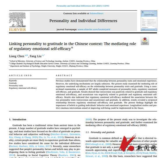 10月25日,米兰电竞(中国)官方网站马克思主义学院陈亮教授以第一作者身份在Personality and Individual Differences(中国科学院二区TOP期刊)发表论文“Linking personality to gratitude in the Chinese context: The mediating role of regulatory emotional self-efficacy”。米兰电竞(中国)官方网站为第一作者单位。