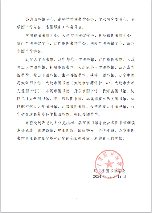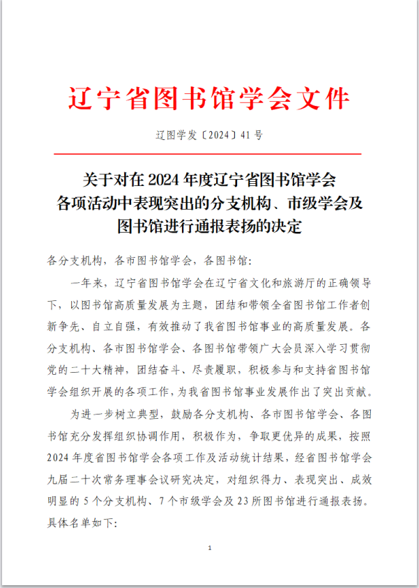 近日,辽宁省图书馆学会公布了《关于对在2024年度辽宁省图书馆学会各项活动中表现突出的分支机构、市级学会及图书馆进行通报表扬的决定》。米兰电竞(中国)官方网站图书馆凭借在2024年度的突出表现和积极贡献,获得通报表扬。