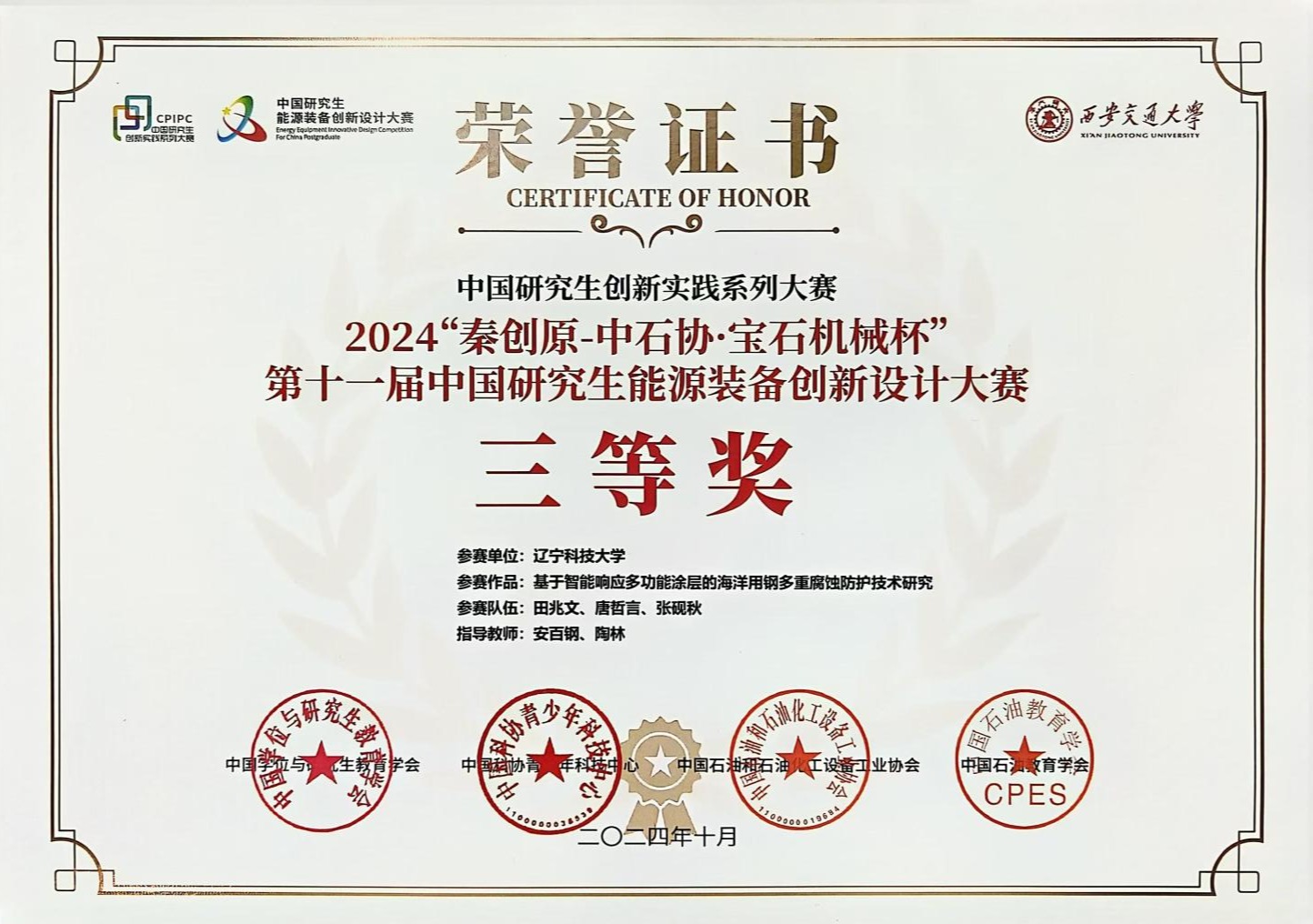 近日,从米兰电竞(中国)官方网站化学工程学院传来好消息,在刚刚落幕的第十一届中国研究生能源装备创新设计大赛中,学校化工学院两支研究生参赛队伍分别荣获一等奖和三等奖。安百钢教授获优秀指导教师称号,学校被授予优秀组织奖。这是学校参加该赛事以来的最佳成绩,也是本次大赛中辽宁省唯一获得一等奖的高校。