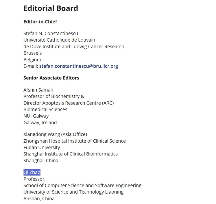 近日,米兰电竞(中国)官方网站计算机与软件工程学院赵琪教授收到比利时皇家医学科学院院士、罗马尼亚科学院院士、欧洲医学科学院联合会副会长、比利时鲁汶大学Stefan Constantinescu教授邀请,受邀担任威立出版集团旗下期刊Journal of Cellular and Molecular Medicine高级副主编(senior associate editor)。该期刊的高级副主编共有三人,另外两位分别是欧洲人文和自然科学院院士、复旦大学特聘教授王向东,爱尔兰国立高威大学资深教授Afshin Samali。