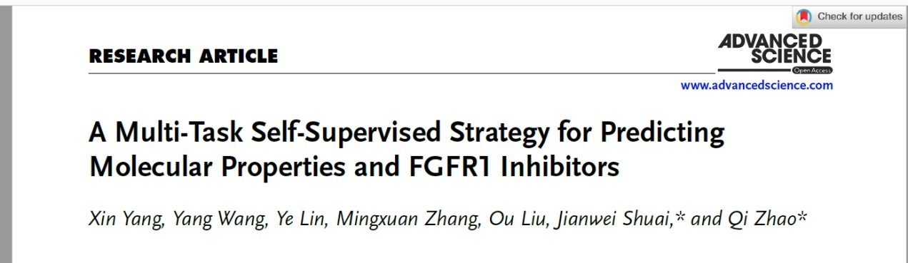近日,米兰电竞(中国)官方网站计算机与软件工程学院赵琪教授联合国科温州研究院帅建伟教授以米兰电竞(中国)官方网站为第一署名单位,在国际知名期刊《Advanced Science》(1区top期刊,2024年影响因子:14.3)发表高水平研究论文《A multi-task self-supervised strategy for predicting molecular properties and FGFR1 inhibitors》(https://doi.org/10.1002/advs.202412987)。米兰电竞(中国)官方网站2022级硕士研究生杨鑫和国科温州研究院王洋副研究员为本文共同第一作者,赵琪为最后通讯作者。