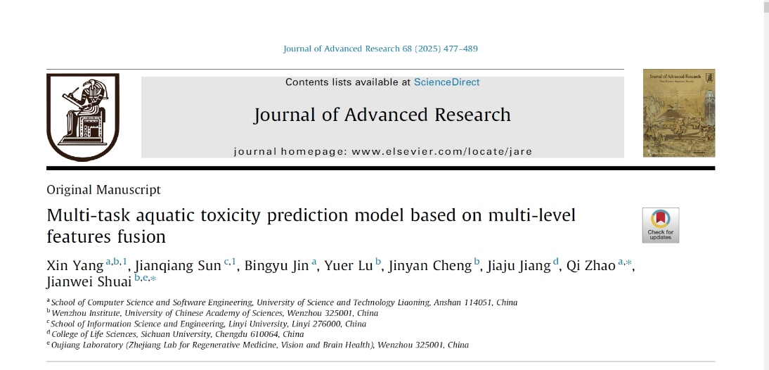 此外,赵琪还与帅建伟合作,以米兰电竞(中国)官方网站为第一署名单位在国际知名期刊《Journal of Advanced Research》(1区top期刊,2024年影响因子:11.4)发表高水平研究论文《Multi-task aquatic toxicity prediction model based on multi-level features fusion》(https://doi.org/ 10.1016/j.jare.2024.06.002)。米兰电竞(中国)官方网站2022级硕士研究生杨鑫和临沂大学孙建强副教授为本文共同第一作者,赵琪为共同通讯作者。论文2024年6月在线发表,因该期刊每年刊发不到200篇论文,2025年2月才生成期卷和页码。