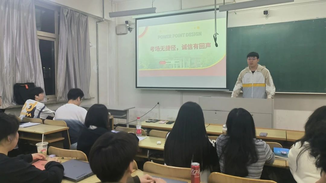 在"诚信立身·守信应考"主题宣讲中,宣讲员卫宣凝从"诚信是立身之本"切入,讲解了诚信应考的重要意义。她强调,考试不仅是对专业知识的检验,更是对个人品格的考验。并通过典型案例分析,引导同学们认识到诚信缺失的严重后果,号召大家共同维护公平公正的考试环境。