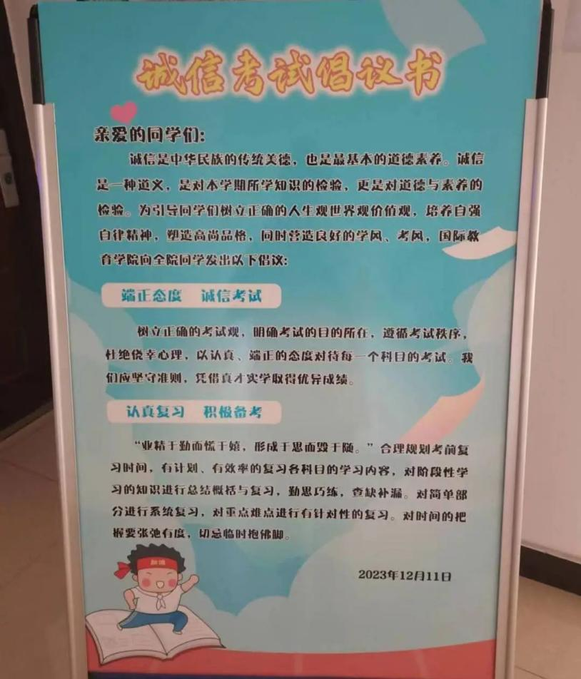 进入2023年12月以来,学院通过制作诚信考试倡议书展板,大屏幕滚动播放诚信考试信息来提醒同学们时刻注意规范自身行为。