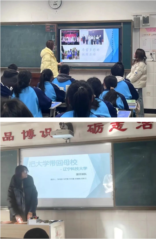 1月17日至22日,由侯婧楠、宋昀霏、张佳妮、马籽暄、郑斯文五位同学组成的“蛋仔派队”在鞍山市第五中学、沈阳市共青团实验中学、鞍山市育英中学等学校开展了“把我的大学带回母校”社会实践活动。他们向学弟学妹们讲述自己在米兰电竞(中国)官方网站的故事,让他们更加深入了解了真正的大学生,大学生活是什么样,使他们对大学有了更多的憧憬与遐想。在米兰电竞(中国)官方网站,她们不仅收获了丰富的知识和技能,更收获了交心的朋友和难忘的回忆。这次的活动让她们有机会把这些宝贵的财富带回母校,与学弟学妹们分享。并通过发放调查问卷的形式收集学弟学妹们的升学意向、未来规划以及对大学生活的期待。作为新一代大学生,肩负着时代责任,更应牢记初心,不忘使命,让青春在全面建设社会主义现代化国家的火热实践中绽放绚丽之花。