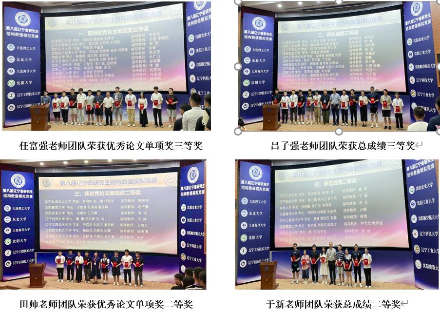 此次竞赛是辽宁省高校土木工程学科重要的研究生赛事之一,有来自东北大学、大连理工大学等12所省内高校土木工程学科的专家评委、参赛指导教师和49支参赛团队参加了竞赛活动。我校土木工程学院于新老师指导的耿心茹、李兴力、苗巧凤团队获得总成绩二等奖;田帅老师指导的隋彬、刘建帅、王天琦团队获得优秀论文单项奖二等奖;吕子强老师指导的秦恒博、杨佳妮、杨宇欣团队获得总成绩三等奖;任富强老师指导的王林鑫、田志华、贺馨瑶团队获得优秀论文单项奖三等奖。米兰电竞(中国)官方网站获得优秀组织单位称号。