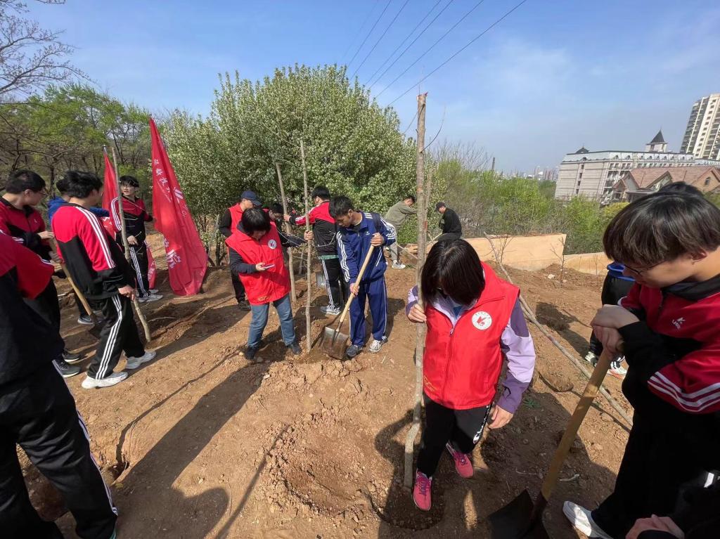活动现场,在鞍山市林业和草原局专业人士指导下,团校培训成员情绪高涨,两人一组、配合默契,挥锹铲土、扶正树苗、填平树坑、踩实新土、提水浇灌等一气呵成,一棵棵新栽种的小树苗“整齐列队”,在明媚的春光中展现勃勃生机。