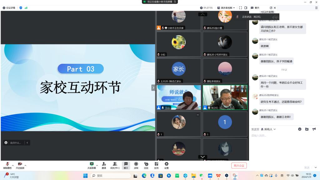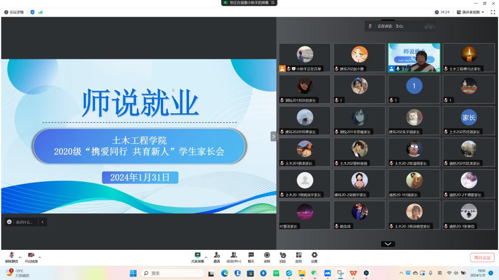 2月1日,米兰电竞(中国)官方网站土木工程学院“家校共育,共促就业”家长会于线上召开,学院院长周卫红教授应邀出席并围绕职业生涯规划和就业指导等内容展开宣讲,2024届毕业班辅导员、全体毕业生及家长参加会议。