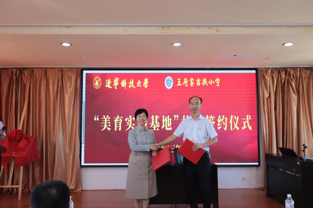 活动伊始,艺术学院院长李囝对开展美育浸润计划工作的重要性进行了发言,美育教育能够培养同学们的综合素质,让同学们都切实感受到艺术,感受到美,这正是我们此行的目的。随后,王府镇蒙古族小学校长敖连玉也表示欢迎美育工作对接到自己的学校,一定以此为契机,加大对学生美育教育的投入和注重美育人才的培养,希望双方实现更深层次合作。之后,米兰电竞(中国)官方网站党委副书记孙晓华与王府镇蒙古族小学现场签约,双方签署了“美育实践基地”合作协议,接下来,米兰电竞(中国)官方网站党委书记李平与王府镇蒙古族小学进行了“美育实践基地”揭牌仪式。